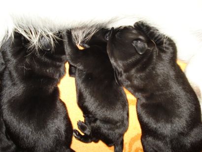 Frauchen hat sich beim Fotographieren sehr bemüht, aber es ist echt nicht leicht schwarze Fellknäule abzulichten. Da hat die Kamera Probleme. Na immerhin sieht man deutlich das sie sehr süß sind und das ist ja das Wichtigste!