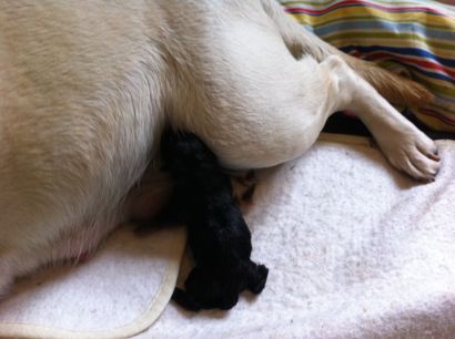 Nachts gegen um 2 Uhr zeigte sich, das es wirklich höchste Eisenbahn war, mich aus dem Tierheim zu holen. Ich fing an zu hecheln, begann Hundebetten und Decken zu zerwühlen, der Schleimpfropfen löste sich, meine Milch begann rauszutropfen und meine Körpertemperatur sank. Jetzt war klar, das es bald losgeht. Erst konnte ich mich nicht entscheiden, ob ich im Hundebett oder auf dem Sessel werfen soll aber Pflegemama konnte mich dann doch überzeugen, das das Bett die bessere Wahl ist. 12:55 Uhr kam mein erstes Baby zur Welt - ein schwarzes Mädchen, 290g schwer. Meine Pflegeeltern machten für mich die Hülle ab und nabelten es ab. Erst wusste ich nicht so ganz was ich damit soll. Baby und Mutterkuchen lagen vor mir und ich kuckte fragend, weil es sicher das erste Mal Mama werden für mich war. Meine Instinkte sagten mir dann aber doch noch, das ich den Kuchen fressen soll und das Baby ablecken. 14:05 Uhr kam wieder ein schwarzes Mädchen (mit weißem Fleck auf der Brust), 350g schwer. Dann 15:20 Uhr ein 300g schweres, schwarzes Mädchen und 15:53 Uhr noch ein schwarzes Mädchen mit 315g. Glücklicherweise wurden mir alle Babies "ausgepackt" und abgenabelt, so das ich sie nur noch trocken lecken musste. Ich war dann ganz schön geschafft und bin eingeschlafen - die Kleinen haben sich während dessen schon mal an meiner Milchbar bedient. Nur gut das alle gesund und munter sind.